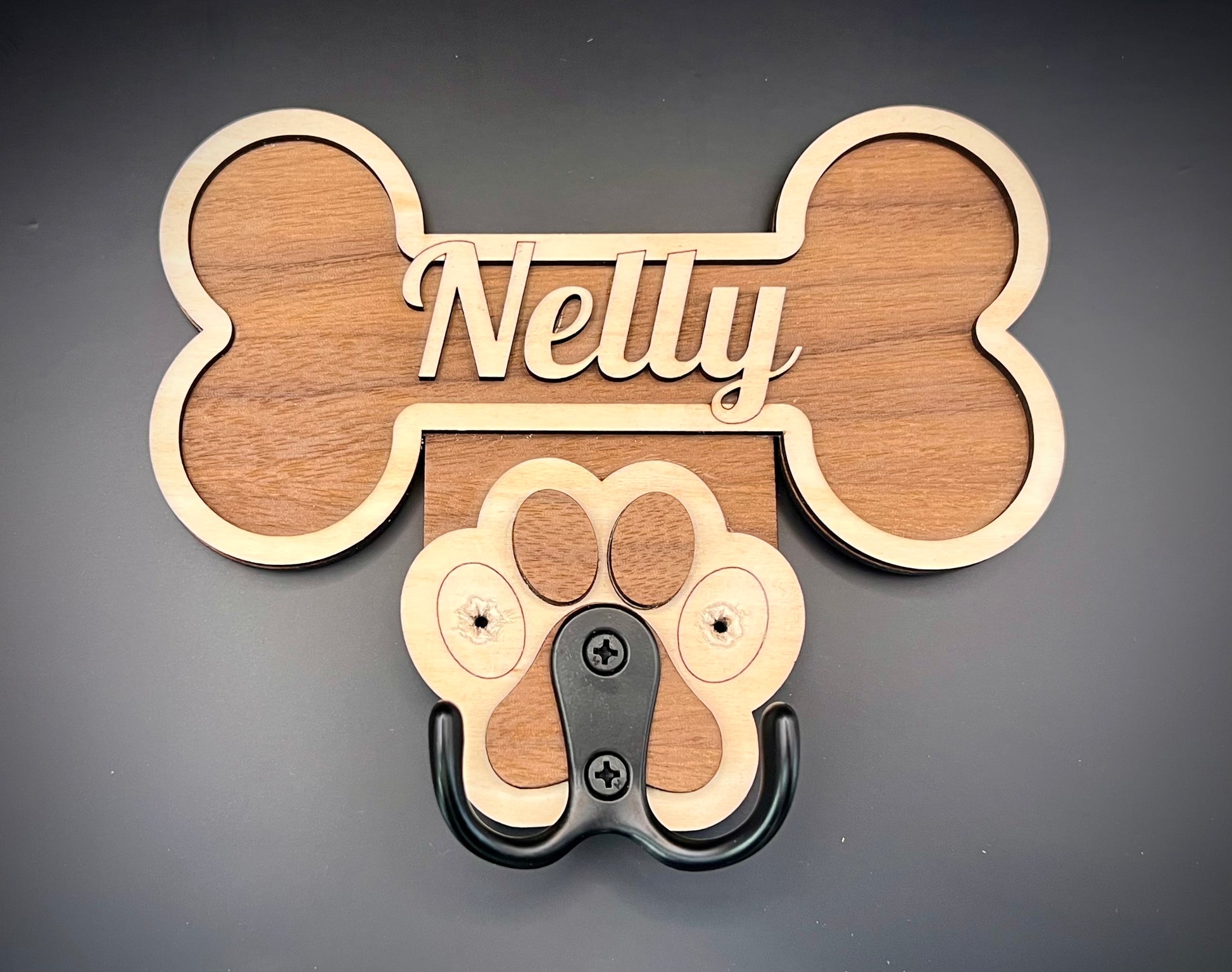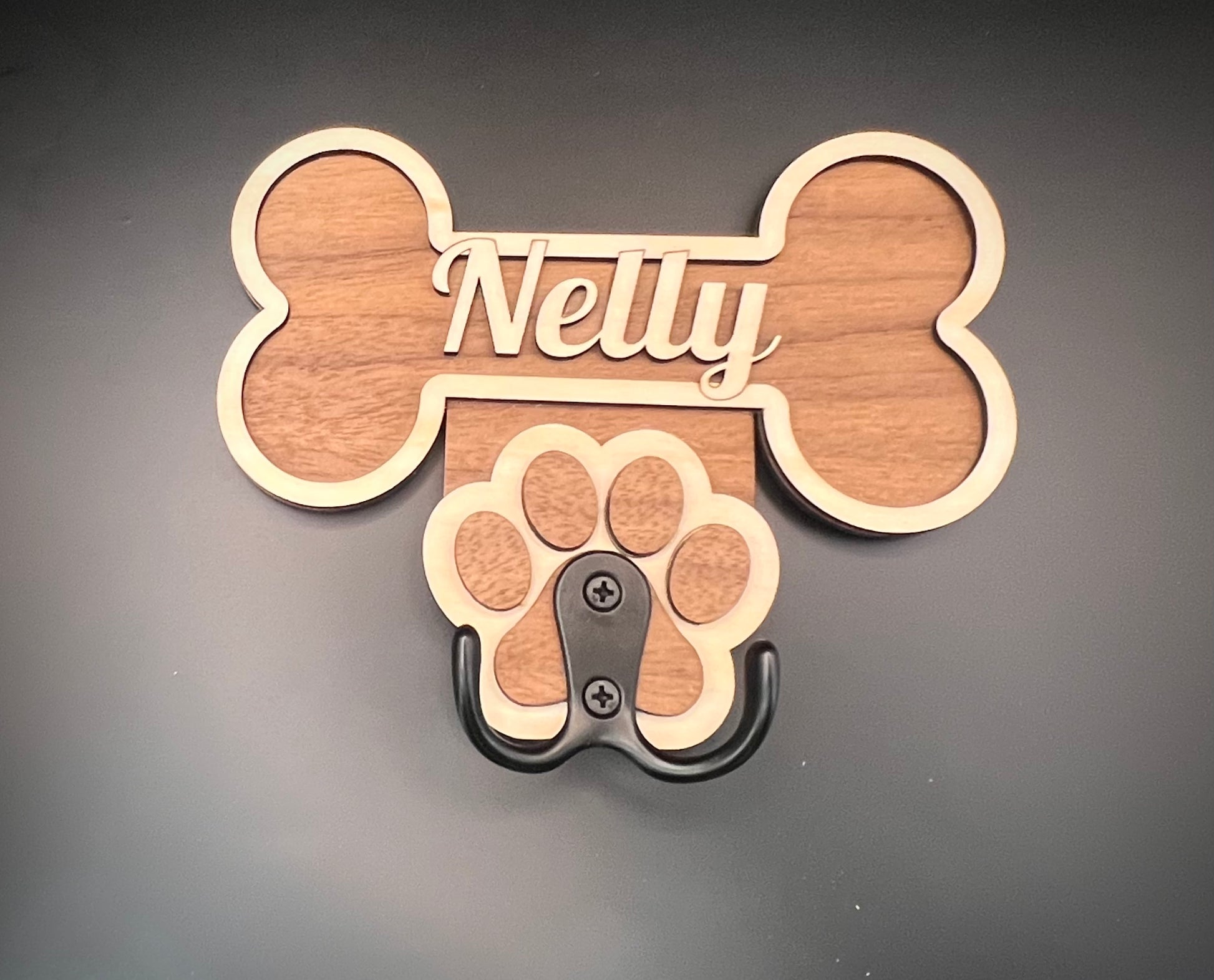 Custom made dog lead hook, made just for you and dog with their name in pride of place. With hidden recessed screw holes providing a seamless look while securely holding your dog's leash to the wall. Say goodbye to messy and tangled leashes with this stylish and practical hook.