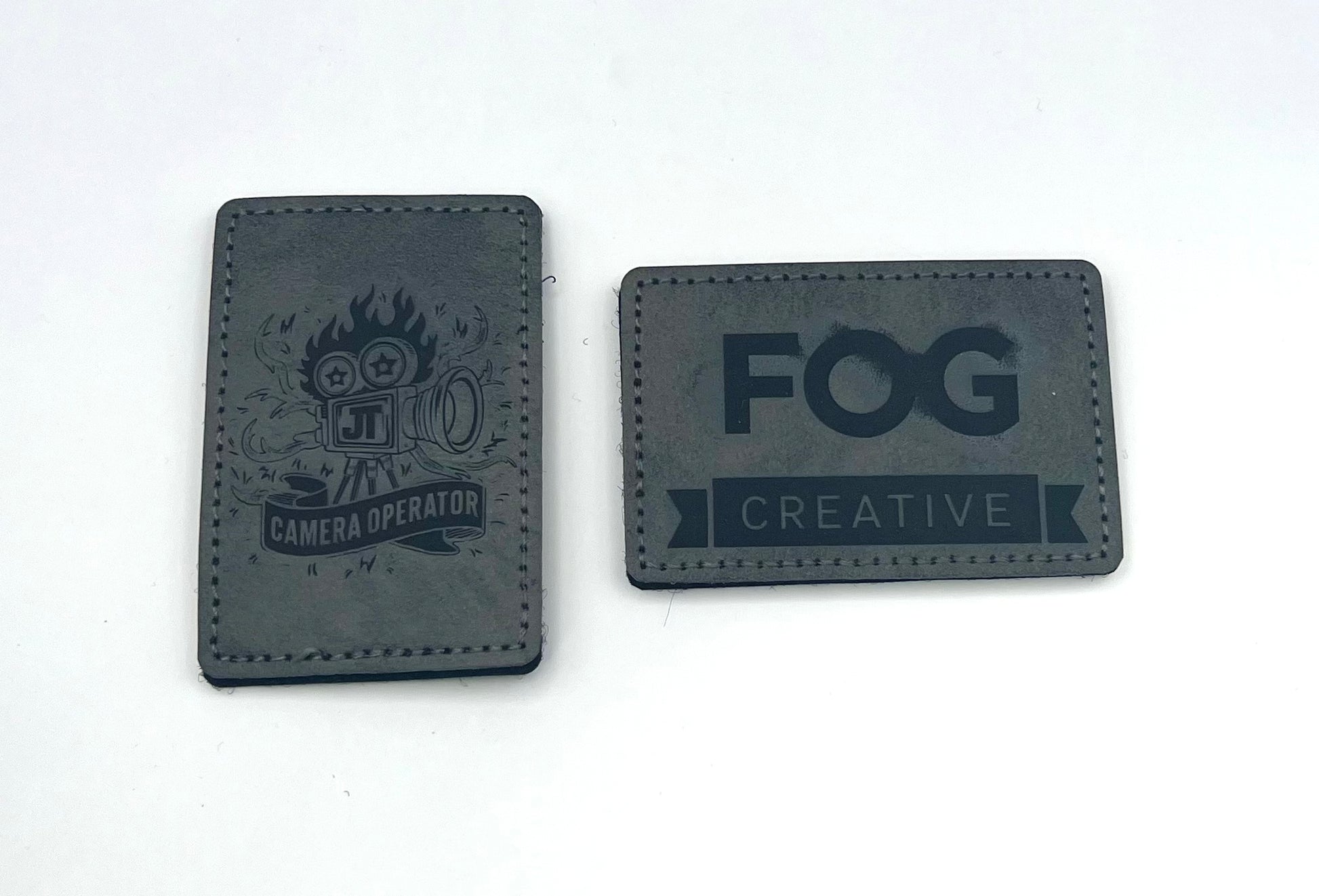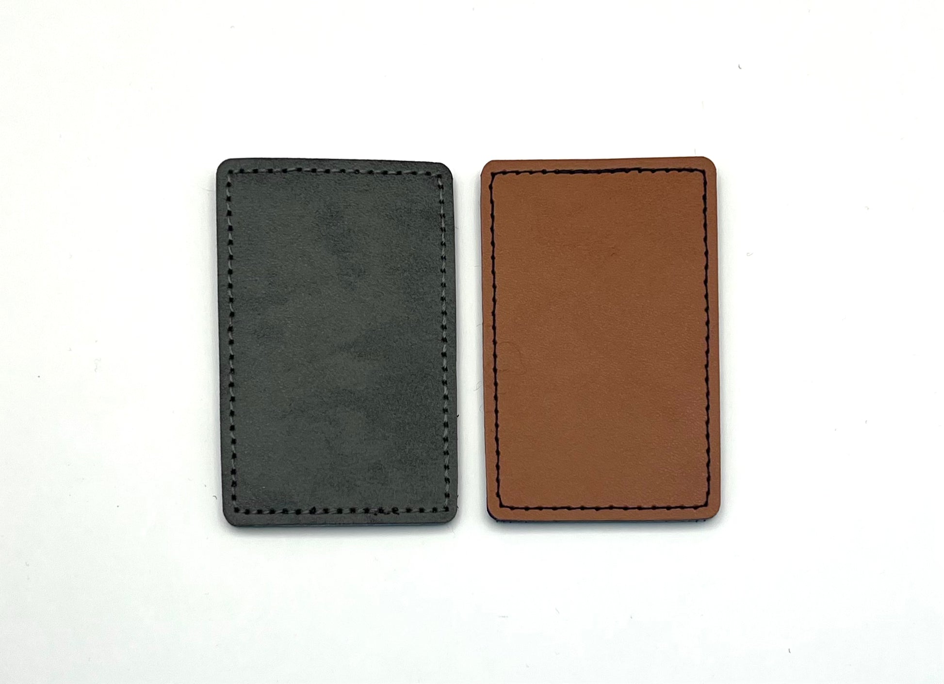 This is a faux leather, laser engraved velcro patch. Available in brown and grey.